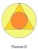 Theorem II: For an equilateral triangle, the ratio of the areas of the circumscribed (outer) and inscribed (inner) circles is 4:1. The area of the ring between the circles is 3 times the area of the inscribed circle. |