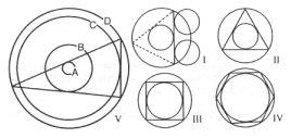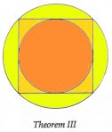 Theorem III: For a square, the ratio of the areas of the circumscribed and inscribed circles is 2:1. If a second square is inscribed within the inscribed circle of the first, and so on to the mth square, then the ratio of the areas of the original circumscribed circle and the innermost circle is 2m:1. |