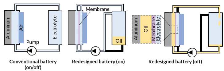 In a conventional aluminum-air battery, the aluminum anode and air cathode are always separated by a liquid electrolyte. In a new version of the battery, an electrolyte is pumped between the electrodes only when the battery is powering another device (middle). When the battery is on standby, oil is pumped into the region between the anode and a polymer membrane to protect the aluminum surface from the corrosive electrolyte (right).