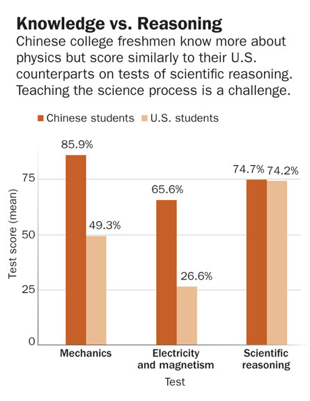 A report in the Jan. 30 Science upped the urgency of the NAS recommendation to focus on process. It found that although Chinese college freshmen knew substantially more about physics laws and principles than their U.S. peers, both groups performed poorly on a test of scientific reasoning skills.