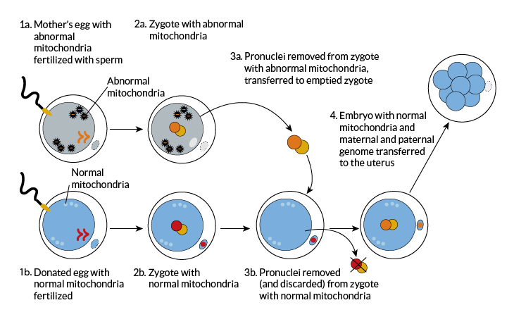 The first “mitochondrial replacement” technique developed to stop mitochondrial diseases is called pronuclear transfer. It was first done in mouse embryos in 1983. Pronuclei are nuclei from the egg and sperm that are in the fertilized egg, called a zygote, but have not yet fused into a single nucleus.