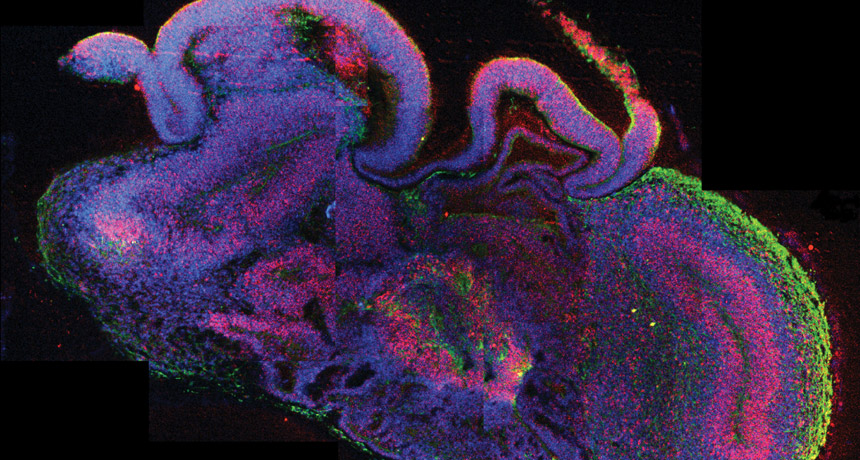 Largely left to their own devices, human stem cells knitted themselves into tissue with a multitude of brain structures and specialized cadres of neurons in a form reminiscent of the brain of a nine-week-old fetus, scientists report August 28 in Nature.