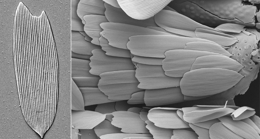 OLDEST MOTH SCALE A tiny insect scale from an ancient lagoon (left) may be one of the earliest fossil signs of the evolutionary branch of moths and butterflies. Comparisons with modern scales (right) identified it.