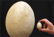Elephant bird eggs An extinct species of bird that once roamed Madagascar laid eggs much larger than anything known today. The largest of these flightless birds was 3 or 4 meters tall, and its eggs could hold as much fluid as 15 dozen chickens’ eggs. (Great elephant bird egg shown with a modern egg.) — Elizabeth Quill