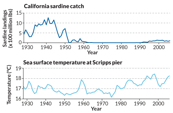 California coast over the previous 50 years. The researchers concluded that ocean temperature changes do cause fluctuations in sardine numbers, even though the relationship between the two is not readily obvious.