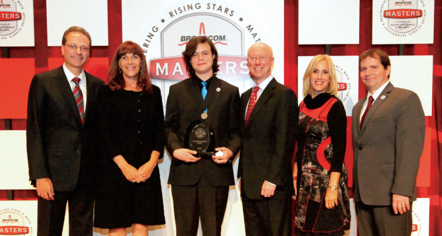 River Grace (third from left) won the Broadcom MASTERS competition. With him were, from left: Henry Samueli of Broadcom Corp., Susan Samueli of the Samueli Foundation, Scott McGregor of Broadcom Corp., Paula Golden of Broadcom Foundation and Rick Bates of SSP.