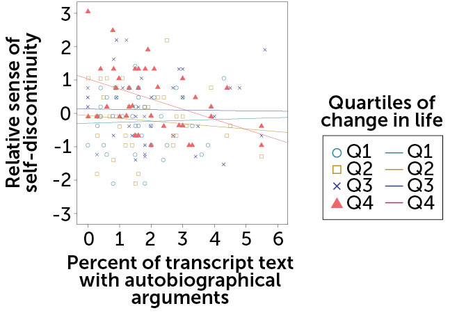 But when the researchers zoomed in on the quarter of participants reporting the greatest level of change, more autobiographical reasoning came with higher levels of self-continuity. “Constructing continuity in the life story buffers against the effect of change in your life,” Habermas says. Other teams have made similar findings.