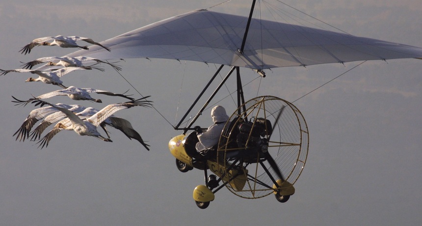 THIS WAY PLEASE Captive-bred whooping cranes get an escort for their first try at migration from an ultralight aircraft. On later migrations though, youngsters get a boost traveling with older birds.