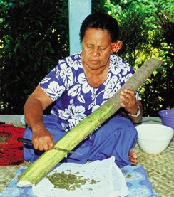 I tag along with Gerlach and Johnson, for whom the Tavana family demonstrates the traditional way to extract starch from the manioc root. The Samoans and the botanists take turns grating the root on a strip of metal dotted with nail holes. The pulp gets kneaded with coconut leaflets and filtered through burlap. A ring of children watches.