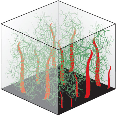 Another fMRI difficulty arises from its view-from-the-top scale. Predicting a single neuron’s activity from fMRI is like trying to tell which way an ant on the ground is crawling from the top of the Washington Monument, without binoculars. The smallest single unit measured by BOLD fMRI, called a voxel, is often a few millimeters on each side, dwarfing the size of individual neurons. Each voxel — a mashup of volume and pixel — holds around 5.5 million neurons, calculates Nikos Logothetis of the Max Planck Institute for Biological Cybernetics in Tübingen, Germany. Assuming that the millions of neurons in a voxel perform identically is like assuming every single ant on the National Mall crawls north at noon.