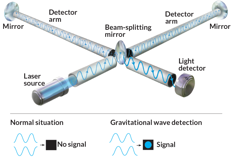 LIGO detects gravitational waves by splitting a laser beam in two, sending light down each arm. The light reflects back and forth between mirrors in the arms, before the beams recombine and are sent to a detector. If the arms are the same length, the light beams will cancel each other out. Any length difference — such as that caused by gravitational waves stretching one arm while squeezing the other — will allow some light through to the detector.