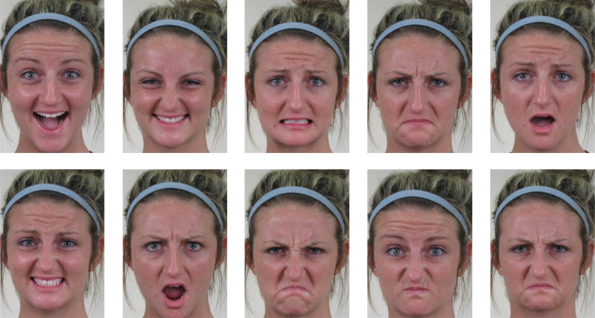 MAKING FACES Human faces are more expressive than scientists gave them credit for. By mixing and matching the six classically recognized facial expressions (happiness, surprise, sadness, anger, fear and disgust), scientists have opened up a new category of expressions for compound emotions, such as “happily surprised” (top left) and “angrily disgusted” (bottom middle).