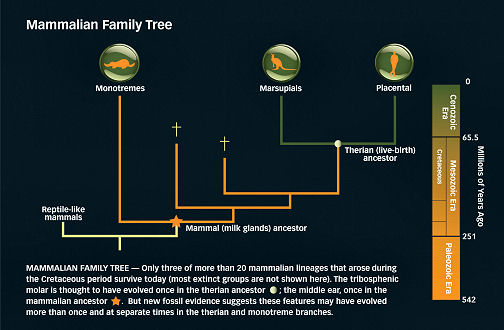 In the past decade, new fossil finds have contradicted long-held views of the simplicity of primitive mammals. They seem to have been just as motley and specialized for life on the land or in water as today’s mammals are. This emerging view of mammal history suggests not only that complex features evolved millions of years earlier than previously thought, but also that they might have evolved independently in different groups.