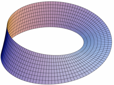 A Möbius band is a two-dimensional surface with the puzzling property of having only one side. Despite this mind-bending characteristic, it’s an easy object to make: just take a long strip of paper, give one end a half-twist, and tape the two ends together. Because of the half-twist, the front side of one end of the strip joins with the reverse side of the other end, so that the taped-together band has only one side.