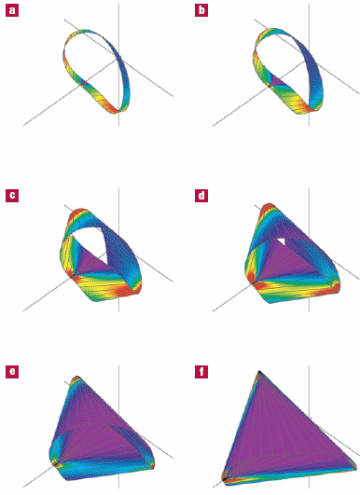 By contrast, a flat, non-stretchy band, such as a strip of paper, can’t quite assume this shape. Try it: The center line of a paper Möbius strip becomes a kind of hilly racetrack, closer to an oval or a triangle than a circle, and it swoops up and down. Furthermore, the paper doesn’t twist smoothly throughout its whole length. Instead most of its 180-degree rotation occurs in a few short, separate sections. The wider the strip of paper, the less circular the Möbius band and the more abruptly the paper twists. Mathematicians have worked out approximate descriptions for paper (or other non-stretching) Möbius bands, but until recently, no one had a precise formula for the shape.