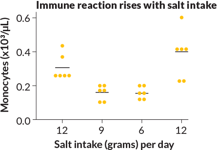 Healthy volunteers (yellow dots) ate diets with varying levels of salt for about 50 days each. At high salt intake, monocytes, white blood cells that play a role in inflammation, increased. At lower salt levels, the opposite happened. (Black bars are mean values.)