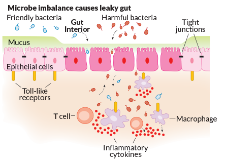 Epithelial cells and mucus that line the intestine protect the rest of the body from pathogens. But a diet heavy in sugars and fats can disrupt the delicate balance of friendly and harmful bacteria and make the gut lining more porous. When bacteria slip through the lining, they set off alarm bells called toll-like receptors. The TLRs signal immune cells, including T cells and macrophages, to produce inflammatory cytokines. The cytokines can weaken the tight junctions between epithelial cells, setting off an inflammatory cycle that might lead to bowel diseases.