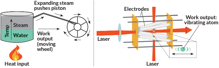 Soon scientists may be able to start playing those games with engines exploiting quantum effects in the lab. German researchers took a step toward that goal in October by building a heat engine consisting of a single atom. Johannes Roßnagel, a quantum physicist at the University of Mainz, and colleagues built a cone-shaped enclosure around a calcium ion. After using a laser and electric field to heat up the ion to about one degree above absolute zero, the researchers measured the work performed by the ion as it exerted a subtle push toward the top of the cone.