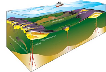 Traditionally, scientists have envisioned most of the under ocean crust as a layer cake of three rock types. The layers correspond to different chemical stages of the magma as it emerges where the plates split and cool. Together, the layers provide a 6-to-7-km-thick covering over Earth’s mantle.