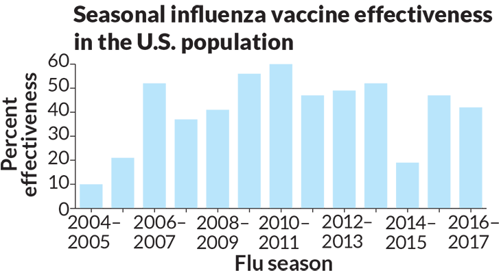 The influenza virus seems so normal to most Americans that only about half of us will heed those “time for your flu shot” banners that pop up at pharmacies and worksites every autumn. Those annual shots remain the best means of protection, but they must be manufactured months before flu season starts, based on a best educated guess of what strains of the virus will be circulating. That means even in a successful year, vaccine performance may not be impressive. During the 2015–2016 season, only about half of those immunized were protected, according to a study in the Aug. 10 New England Journal of Medicine. Some years’ vaccines are duds: For the 2014–2015 season, the vaccine protected only 19 percent of people who received it, based on U.S. Centers for Disease Control and Prevention data.