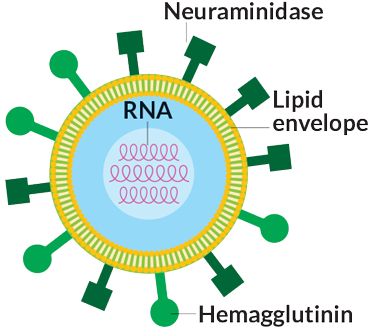 Researchers often describe the flu virus as looking like a ball with lollipops sticking out. Tucked inside the ball is RNA, which the virus needs to make copies of itself. The lollipops on the outside are proteins: hemagglutinin and neuraminidase. There are 18 different kinds of hemagglutinin and 11 kinds of neuraminidase. Each kind of flu virus is named for its particular combination of these proteins; the current forms circulating around the world are H1N1 and H3N2. Hemagglutinin attaches to human cells to launch an infection; neuraminidase is more important for spreading the virus once infection has occurred.