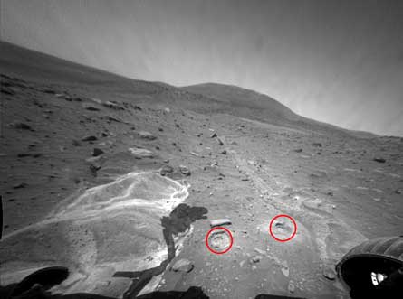 Spirit’s wheels straddle what appears to be a geological boundary at the edge of an 8-meter-wide crater. The soft sand churned up by Spirit’s front left wheel has the highest sulfur content yet seen on Mars, Arvidson said. Sulfur is associated with the presence of water or steam, he said. But the material near the broken right wheel is much lower in sulfur.