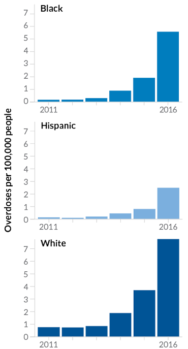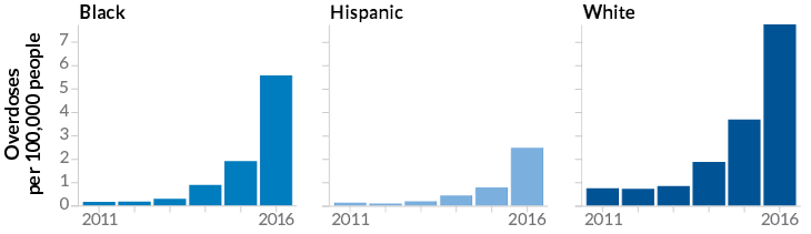 By 2016, fentanyl-related drug overdoses among blacks and Hispanics had started to catch up to non-Hispanic whites. The death rate for blacks rose 140.6 percent annually, on average, to 5.6 deaths per 100,000 people in 2016, and Hispanics’ rate rose 118.3 percent, to 2.5. Whites remain the most affected group, with a rate of 7.7 deaths per 100,000 people, an annual increase, on average, of 61 percent over the same period.