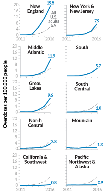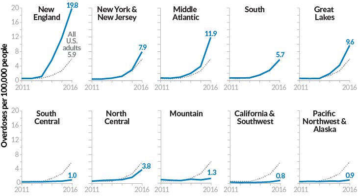 Eastern and Midwestern U.S. states have been the most affected by the fentanyl epidemic, particularly New England, while western states have seen much lower increases in overdose deaths. In 2016, deaths rates ranged from 0.8 per 100,000 people in the public health region that includes California, Hawaii and the Southwest to 19.8 per 100,000 in New England.