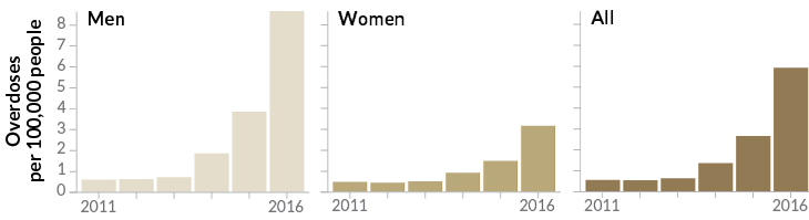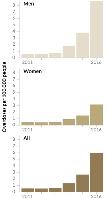 From 2011 to 2013, the death rates among men and women from fentanyl-related drug overdoses were similar and hovered around 0.5 deaths per 100,000 people. But deaths among men started growing faster in 2013, and reached a rate of 8.6 per 100,000 in 2016, nearly three times the rate for women. Researchers aren’t sure why. The overall death rate grew from 0.5 deaths per 100,000 in 2011 to 5.9 in 2016.