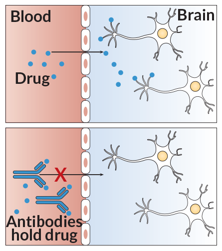 Easier said than done. For starters, drug molecules are tiny, much smaller than a bacterium or virus, and are not easily detected by the immune system. In addition, the body’s immune system is set up to fight invaders that arrive in small groups. When an influenza virus makes its way into a body, the initial levels of virus in the blood are very low, Volkow says. But when people inject heroin, for example, many millions of drug molecules and their breakdown products quickly rush into the bloodstream. In recent years, researchers have found new ways to help call the immune system’s attention to such surges of “invading” drugs.