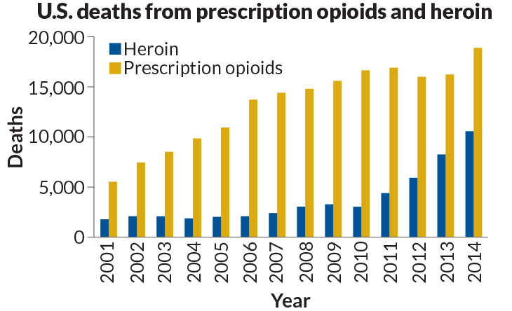 In recent decades, overdoses of both illicit and prescription drugs have surged. In 2014, overdose deaths surpassed deaths from motor vehicle accidents, the U.S. Centers for Disease Control and Prevention reported in January. In that year, 28,647 people died of opioid-related overdoses, primarily from prescription pain relievers and heroin.