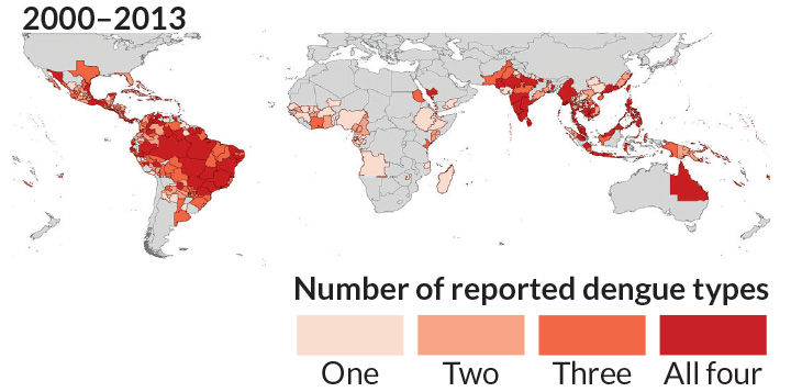 Vaccine development is tricky because dengue is caused by four viruses, each slightly different but all capable of causing disease on their own. While infection with one version, called a serotype, is thought to confer lifelong immunity against that serotype, a subsequent infection from a different serotype can be worse than the first. The second time around, leftover antibodies from the first episode can sometimes turn traitor, enhancing growth of the virus inside the body.
