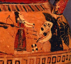 Art scholars have generally interpreted the monster (yellow face at right) as a sea serpent emerging from a black cave, but Mayor and a group of paleontologists think the creature might actually be the fossil skull of an extinct giraffe eroding out of a hillside. Mayor’s analysis of the vase painting appears in the February Oxford Journal of Archaeology.