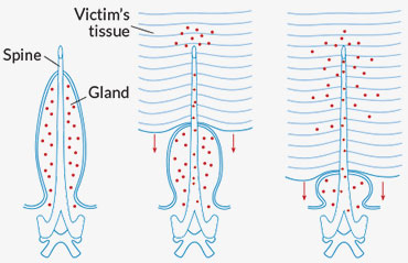 Other fish venoms share their modes of action with certain venoms from other animals. For example, the venoms of stonefishes, snakes and some other organisms contain hyaluronidase, an enzyme that dissolves some of the matrix that supports cells. In that way, the enzyme helps the other venom molecules speed through the victim’s tissues.