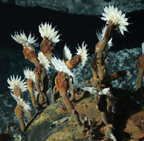 “The classic example” of a vent creature, German notes, “is those giant tube worms, perhaps 8 feet [2.4 meters] long. But you don’t find those outside the Pacific.” First identified on the Galápagos section of the ridge, these worms don’t inhabit the northeastern Pacific. There, smaller tube worms congregate.