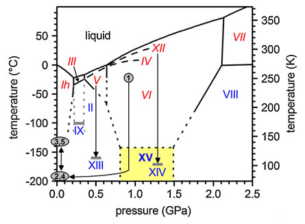 To create the elusive ice, Salzmann and his colleagues dropped the temperature on another kind of ice, ice VI, in which water molecules are bonded to each other willy-nilly. As the researchers lowered the temperature to 130 kelvins (around -143º Celsius) and held the pressure around one gigapascal (almost 10,000 atmospheres), disordered hydrogen bonds in ice VI snapped into a highly ordered, tight conformation and created ice XV. Ice on Earth is downright fluffy in comparison with the newly discovered ice XV.