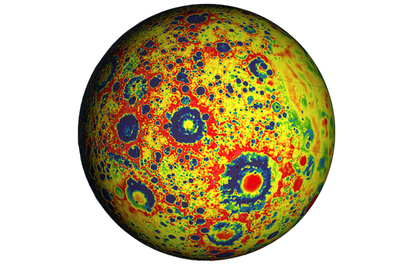 A detailed map of the moon’s gravity reveals variations across the lunar surface. The map shows huge rings around impact craters (red represents areas of high mass concentration; blue, low mass).