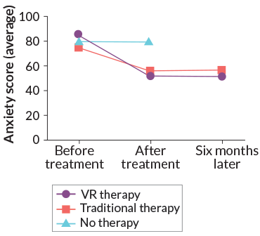 Before and after 14 weekly therapy sessions, participants reported their fear and avoidance of social situations from 0 to 144, with higher scores indicating more severe anxiety. Starting scores averaged between 75 and 85. Participants who got VR treatment dropped an average of 33 points, whereas real-life exposure participants dropped an average of 19. The no-treatment group stayed about the same. These results, reported in the April 2017 British Journal of Psychiatry, suggest that VR is at least as effective as real-life exposure for social anxiety.