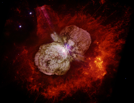 From 1838 to 1858, astronomers watched the binary giant star Eta Carinae erupt, shedding more than 10 solar masses of material and producing an oddly shaped, double-lobed cloud 7,500 light years from Earth. Scientists have thought a dense stellar wind fueled Eta Carinae’s outburst, and considered it the prototype for “supernova impostors,” or shorter-lived eruptions that don’t quite destroy a star.