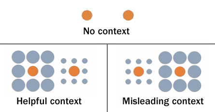 In helpful images, large gray circles surrounded the smaller orange circle to make it appear smaller than it actually was. Small circles surrounded the larger orange circle to magnify its apparent size.