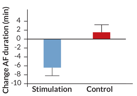 At intensities so low they didn’t cause any perceptible change in heart rate, vagus stimulation controlled atrial fibrillation in dogs, Scherlag and colleagues reported in 2011. In 20 people receiving surgery for atrial fibrillation, low-level vagus stimulation reduced the duration of heart fluttering episodes from an average of 16.7 minutes to an average of 10.4 minutes, Scherlag and his colleagues reported in the Journal of the American College of Cardiology in March.
