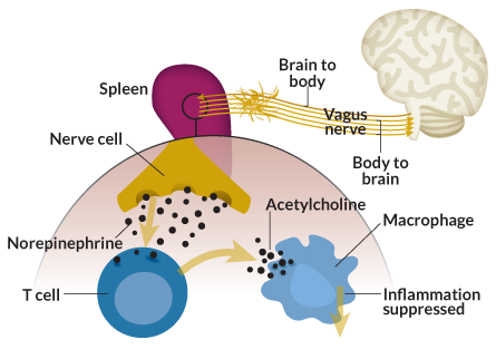 “When we cut the vagus nerve, which runs from the brain stem down to the spleen, the effect was gone,” says Tracey, president and CEO of the Feinstein Institute for Medical Research in Manhasset, N.Y. Later research indicated that stimulating undamaged vagus fibers also had anti-inflammatory effects in animals.