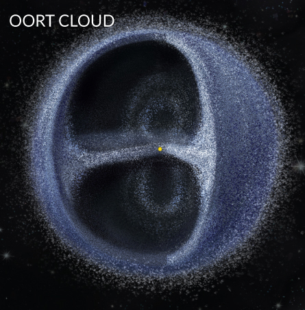 The sun, planets and Voyager probes sit inside the tiny yellow dot at right, within a giant sphere called the Oort cloud. This reservoir of trillions of ice chunks extends 100,000 astronomical units out, tethered to the sun by gravity. Astronomers believe these objects got thrown out of the inner solar system as the planets took shape 4.5 billion years ago. Occasionally these castaways pass near Earth: The comet ISON, which may light up the night sky this November, started out in the Oort cloud. The Voyagers would have to travel another 30,000 years before clearing this broadest definition of the solar system.