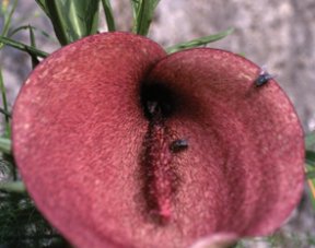In nature, once flies buzz in to explore the dead-horse–arum bloom, many crawl down into the pocket where the spathe narrows to surround the base of the finger. That pocket contains a band of male florets above a band of female florets. Spines and filaments at the entrance to the pocket imprison the flies.