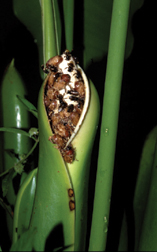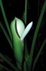 Like the dead-horse arum, this philodendron in its native Brazil lures insects inside. The philodendron’s spathe closes over scarab beetles for only 12 hours. Yet the beetles remain for some 22 hours. While in the bloom, they mate, feed, and brush pollen onto female flowers. At the end of the beetles’ stay, they pick up pollen from just-matured male flowers and fly off to another bloom.