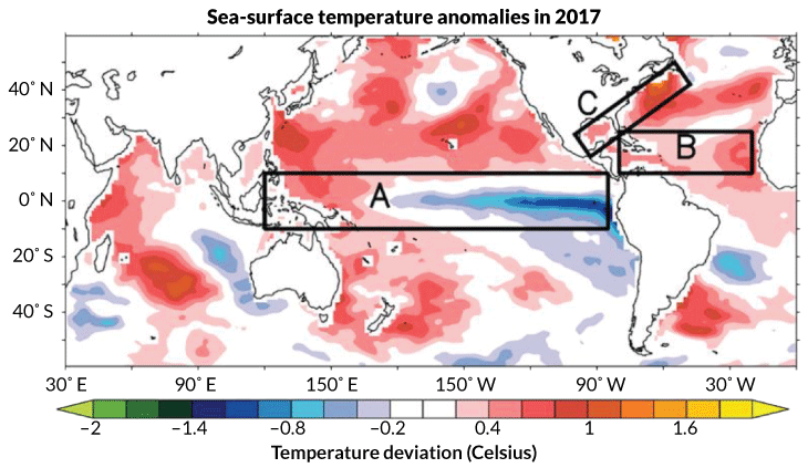 In 2017, Atlantic Ocean waters were as much as a degree Celsius warmer than the average temperature for the same period from 1982 to 2012. New simulations indicate that warm waters in the tropical Atlantic Ocean (box B) were the primary cause behind 2017’s large number of intense hurricanes, rather than anomalously cold Pacific waters due to the onset of La Niña (box A) or warm waters along the U.S. East Coast (box C).
