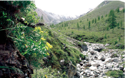 HILLSIDE HABITAT. Rhodiola rosea (yellow flowers at left) grows in the Altai Mountains of Siberia. The plant thrives in cold climates at high altitudes. Brown