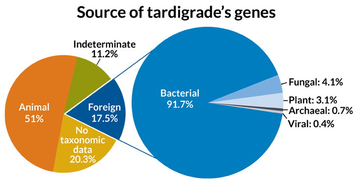 GENE INVASION Tardigrades get 17.5 percent of their genes from other organisms, the most of any animal. Of that foreign DNA, the most comes from bacteria.