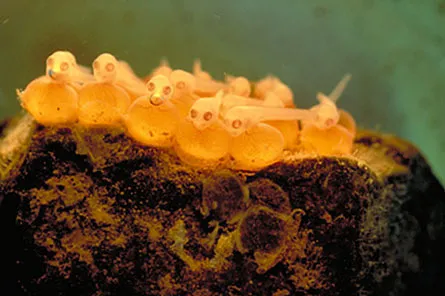 Toadfish larvae, translucent orange with ducklike shapes, prove relatively easy to trace neural development in. The nerves that form eventually control just one pair of muscles that make their swim bladders vibrate to make sound. “You can’t get any simpler than that,” Bass says.