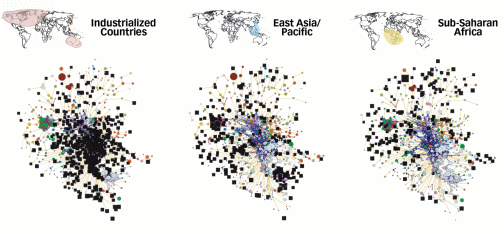 On the other hand, economic activities toward the periphery of the product space have fewer links. These tend to be industries, such as mining or the growing of certain crops, that require infrastructure or skills with few alternative uses. Historically, countries that rely on them have had a hard time branching out into new industries. The network’s structure is a stark reminder of the difficulties that these countries face, and the four authors admit that it doesn’t point to an easy solution. “Nevertheless,” Barabási says, “it’s important to understand what are the causes and the consequences of where these countries are.”